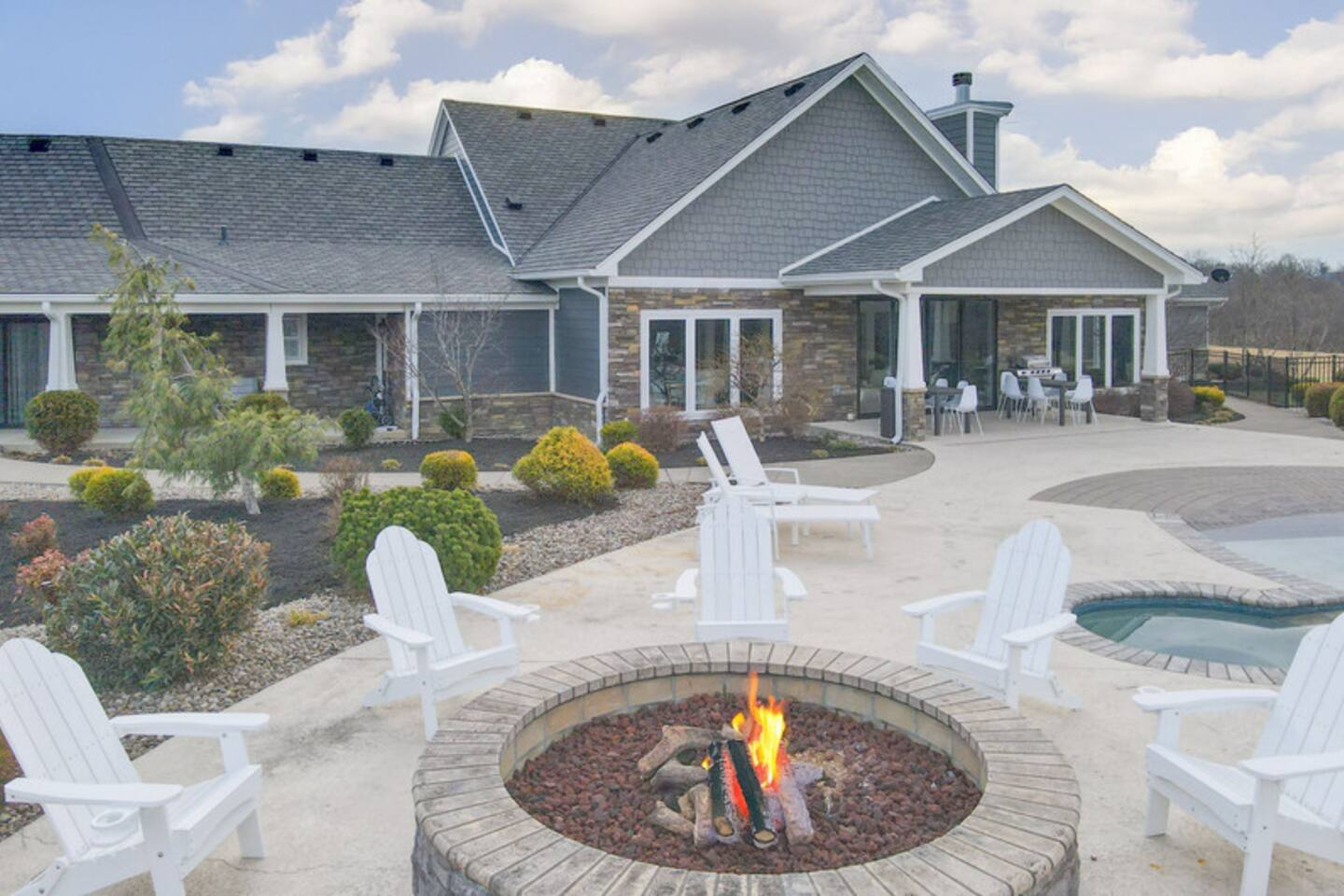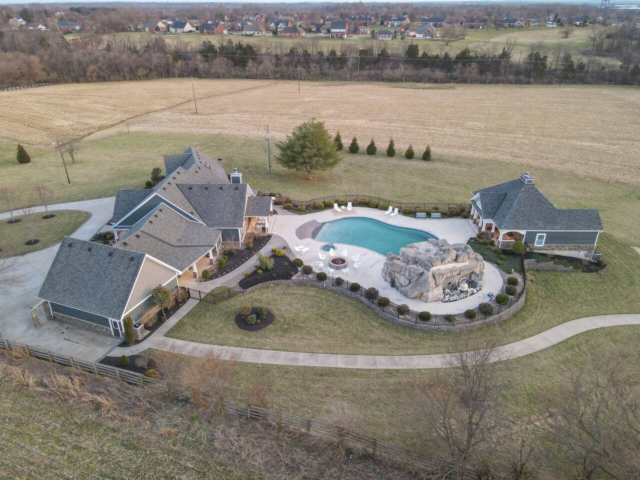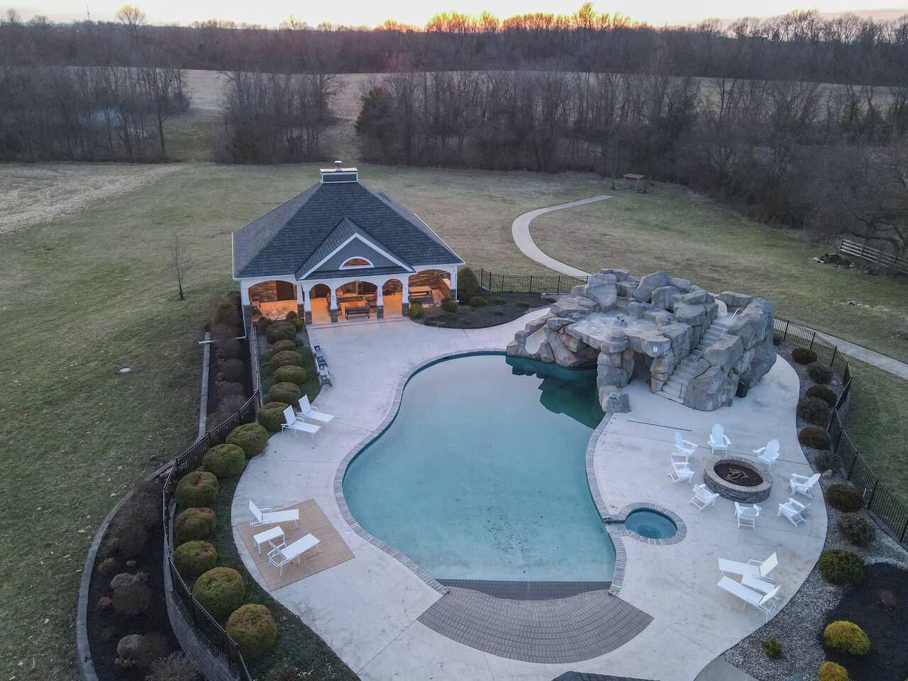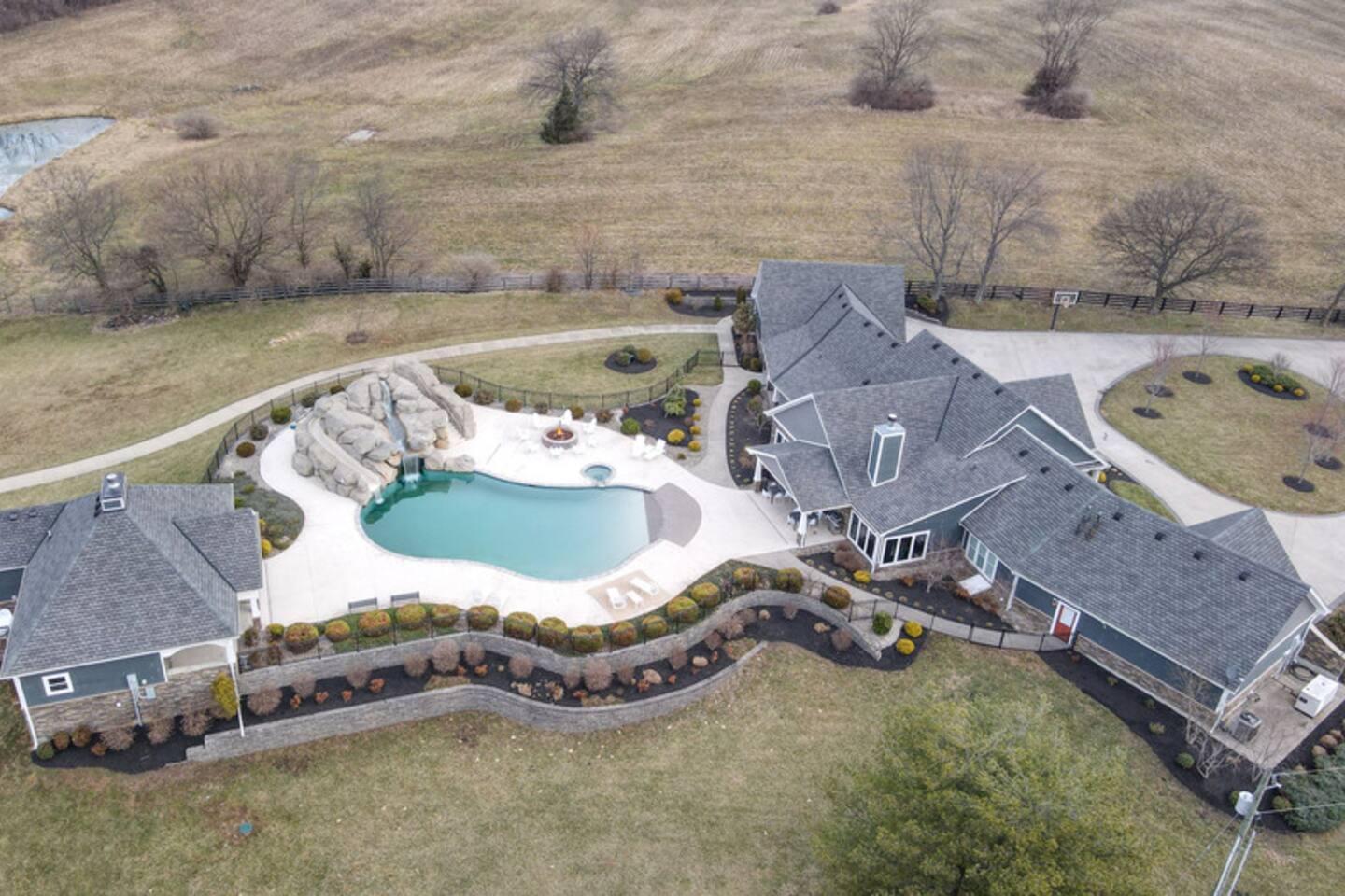 From the moment you arrive, you’ll be surrounded by rolling Bluegrass landscapes, golden sunsets, and the rich aroma of aging bourbon. Whether you’re here to explore historic distilleries, take in the thrill of the racetrack, or simply unwind in an atmosphere of comfort and style, The Bluegrass Grand Estate is your perfect escape into the heart of Kentucky luxury. Step inside through the grand entrance, where you’re immediately welcomed into a bright and inviting foyer. To your right, an elegant dining room awaits—perfect for hosting memorable meals and intimate gatherings. As you continue through the home, you’ll find the open-concept chef’s kitchen, beautifully designed to be both functional and stylish. Sleek countertops, high-end appliances, and ample seating create a space where conversation and cooking flow effortlessly. The fully stocked kitchen includes stainless steel appliances, a refrigerator, coffee maker, blender, toaster, and crockpot, along with all necessary cookware and bakeware. A built-in mini fridge in the second dining room adds extra convenience. Past the kitchen, the home unfolds into the main living area, where plush seating, a large TV, and a cozy sitting room create the perfect ambiance for unwinding after a day of exploring the Bourbon Trail. The estate boasts five beautifully appointed bedrooms, providing ample space for families, friends, and groups to relax in comfort. The Master Suite is a private retreat with a king bed, day bed, additional twin bed, a pack ‘n play, a flat-screen TV, a walk-in closet, and a private laundry room. The en-suite bathroom features a walk-in shower and double sinks. The Kentucky Derby Room is a classic and elegant space with a king bed, luxurious bedding, and a flat-screen TV, conveniently located near the hall bath. The Bluegrass Room offers a warm and inviting setting with a queen bed, a flat-screen TV, and easy access to the hall bath. The Bourbon Room is a sophisticated sanctuary featuring a king bed, private en-suite bathroom with a handicapped-accessible soaking tub, laundry room, and flat-screen TV. Tucked just off the sitting room, the hidden speakeasy offers not only a unique and intimate space to unwind, but also doubles as an additional bedroom thanks to its comfortable futon—ideal for extra guests or a cozy night in. For guests needing to work remotely or stay connected, the estate includes a dedicated office space with a laptop and printer, high-speed Wi-Fi throughout the home, and multiple TVs in all bedrooms and common areas to ensure everyone has their own entertainment space. This estate offers endless entertainment and relaxation options, ensuring every guest experiences a stay like no other. Hidden beyond the fully equipped office space, an entertainment haven awaits, featuring darts, Pop-A-Shot basketball, ping pong, shuffleboard, and classic arcade games, including Big Buck Hunter, Ms. Pac-Man, Galaga, and Golden Tee 3D. Four large TVs make it the ultimate game-day retreat. Tucked away off the sitting room, a hidden speakeasy invites guests to step back in time. With low lighting, rich tones, and plush seating, it’s the perfect spot to enjoy a fine bourbon and great conversation. Step outside into your private backyard paradise, where a shimmering swimming pool with a built-in water slide and cascading waterfall awaits. A luxurious built-in hot tub offers the perfect setting for stargazing. A cozy gas fire pit is surrounded by Adirondack seating for evening gatherings, while an outdoor dining area with a propane grill makes alfresco meals easy and enjoyable. The outdoor area includes a bathroom and dressing room for convenience, as well as a charming outdoor fireplace for cool Kentucky evenings. Ample seating and lounging areas allow guests to fully embrace the outdoor experience. At The Bluegrass Grand Estate, every detail has been thoughtfully curated to create an unforgettable experience. Whether you’re here to explore world-famous distilleries on the Kentucky Bourbon Trail, experience the thrill of horse racing at Churchill Downs, relax in your private poolside retreat, host unforgettable gatherings in a sophisticated setting, enjoy friendly competition in the fully stocked arcade-style game room, or sip bourbon in the speakeasy and indulge in Kentucky’s finest traditions, you’ll find every moment filled with elegance, warmth, and the true spirit of Bluegrass luxury.