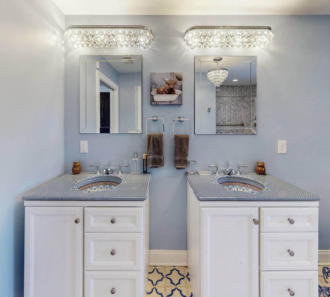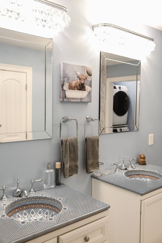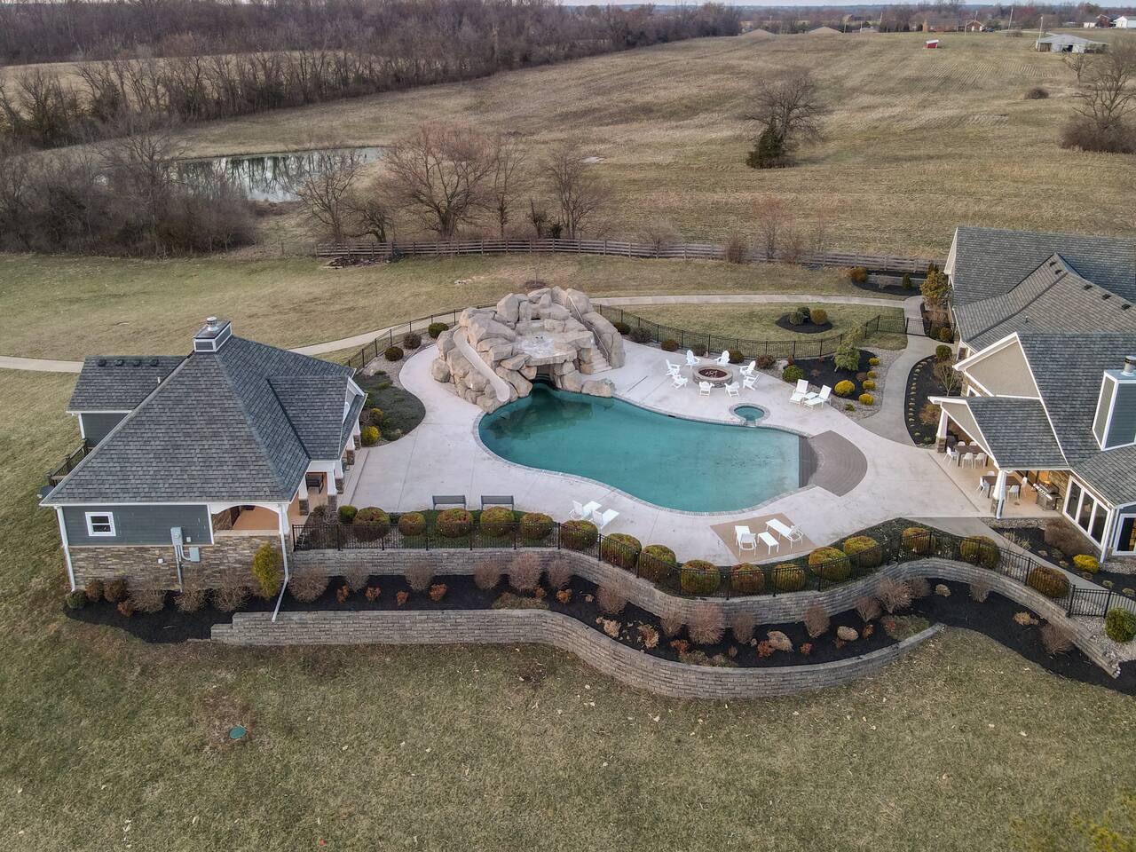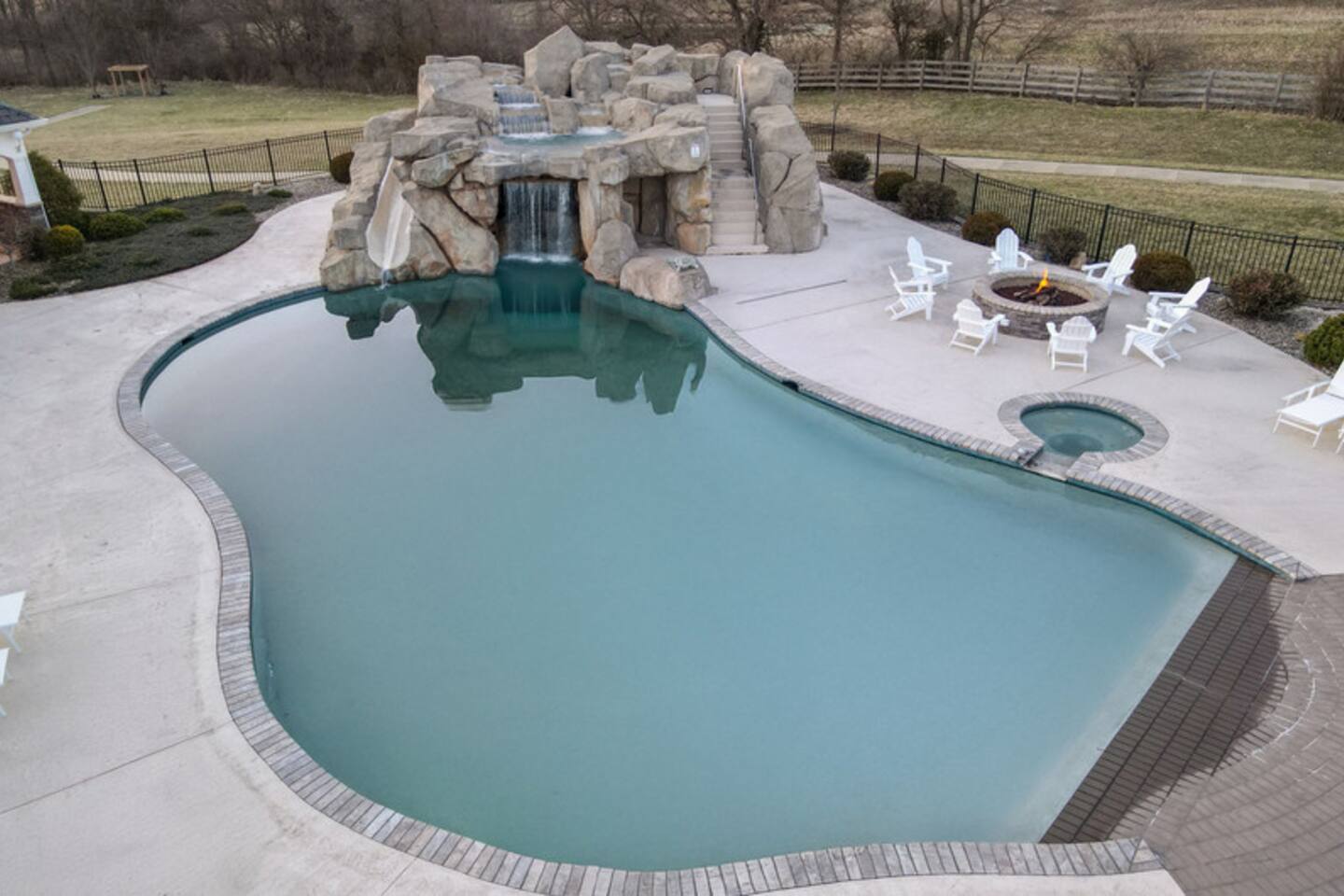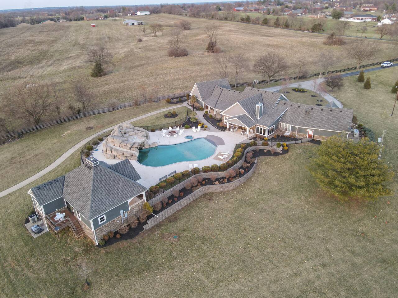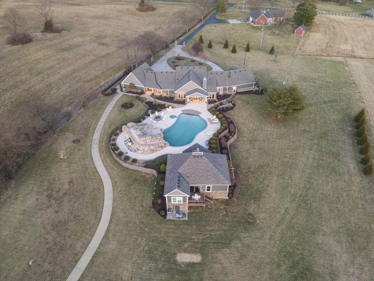From the moment you arrive, you’ll be surrounded by rolling Bluegrass landscapes, golden sunsets, and the rich aroma of aging bourbon. Whether you’re here to explore historic distilleries, take in the thrill of the racetrack, or simply unwind in an atmosphere of comfort and style, The Bluegrass Grand Estate is your perfect escape into the heart of Kentucky luxury. Step inside through the grand entrance, where you’re immediately welcomed into a bright and inviting foyer. To your right, an elegant dining room awaits—perfect for hosting memorable meals and intimate gatherings. As you continue through the home, you’ll find the open-concept chef’s kitchen, beautifully designed to be both functional and stylish. Sleek countertops, high-end appliances, and ample seating create a space where conversation and cooking flow effortlessly. The fully stocked kitchen includes stainless steel appliances, a refrigerator, coffee maker, blender, toaster, and crockpot, along with all necessary cookware and bakeware. A built-in mini fridge in the second dining room adds extra convenience. Past the kitchen, the home unfolds into the main living area, where plush seating, a large TV, and a cozy sitting room create the perfect ambiance for unwinding after a day of exploring the Bourbon Trail. The estate boasts five beautifully appointed bedrooms, providing ample space for families, friends, and groups to relax in comfort. The Master Suite is a private retreat with a king bed, day bed, additional twin bed, a pack ‘n play, a flat-screen TV, a walk-in closet, and a private laundry room. The en-suite bathroom features a walk-in shower and double sinks. The Kentucky Derby Room is a classic and elegant space with a king bed, luxurious bedding, and a flat-screen TV, conveniently located near the hall bath. The Bluegrass Room offers a warm and inviting setting with a queen bed, a flat-screen TV, and easy access to the hall bath. The Bourbon Room is a sophisticated sanctuary featuring a king bed, private en-suite bathroom with a handicapped-accessible soaking tub, laundry room, and flat-screen TV. Tucked just off the sitting room, the hidden speakeasy offers not only a unique and intimate space to unwind, but also doubles as an additional bedroom thanks to its comfortable futon—ideal for extra guests or a cozy night in. For guests needing to work remotely or stay connected, the estate includes a dedicated office space with a laptop and printer, high-speed Wi-Fi throughout the home, and multiple TVs in all bedrooms and common areas to ensure everyone has their own entertainment space. This estate offers endless entertainment and relaxation options, ensuring every guest experiences a stay like no other. Hidden beyond the fully equipped office space, an entertainment haven awaits, featuring darts, Pop-A-Shot basketball, ping pong, shuffleboard, and classic arcade games, including Big Buck Hunter, Ms. Pac-Man, Galaga, and Golden Tee 3D. Four large TVs make it the ultimate game-day retreat. Tucked away off the sitting room, a hidden speakeasy invites guests to step back in time. With low lighting, rich tones, and plush seating, it’s the perfect spot to enjoy a fine bourbon and great conversation. Step outside into your private backyard paradise, where a shimmering swimming pool with a built-in water slide and cascading waterfall awaits. A luxurious built-in hot tub offers the perfect setting for stargazing. A cozy gas fire pit is surrounded by Adirondack seating for evening gatherings, while an outdoor dining area with a propane grill makes alfresco meals easy and enjoyable. The outdoor area includes a bathroom and dressing room for convenience, as well as a charming outdoor fireplace for cool Kentucky evenings. Ample seating and lounging areas allow guests to fully embrace the outdoor experience. At The Bluegrass Grand Estate, every detail has been thoughtfully curated to create an unforgettable experience. Whether you’re here to explore world-famous distilleries on the Kentucky Bourbon Trail, experience the thrill of horse racing at Churchill Downs, relax in your private poolside retreat, host unforgettable gatherings in a sophisticated setting, enjoy friendly competition in the fully stocked arcade-style game room, or sip bourbon in the speakeasy and indulge in Kentucky’s finest traditions, you’ll find every moment filled with elegance, warmth, and the true spirit of Bluegrass luxury.