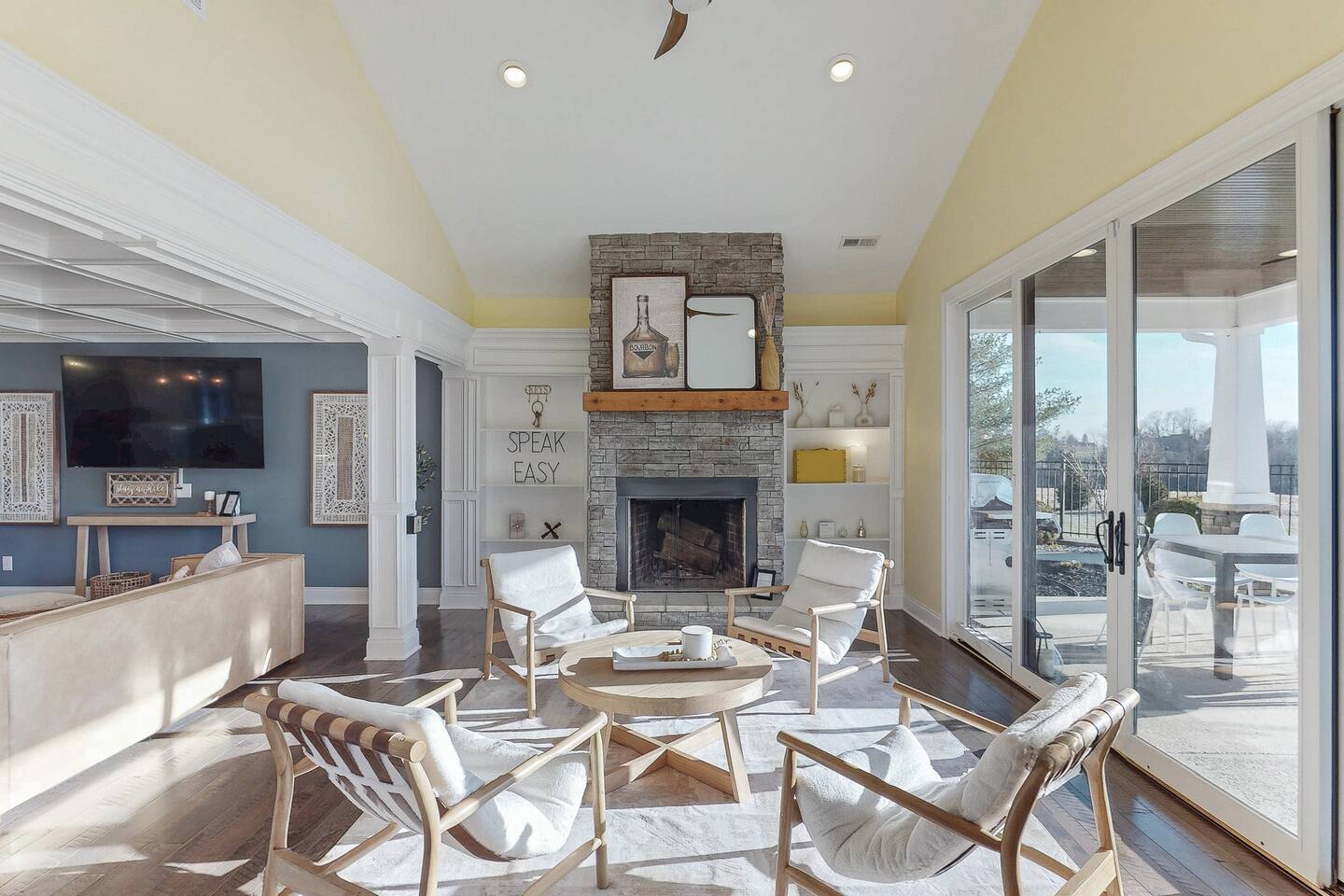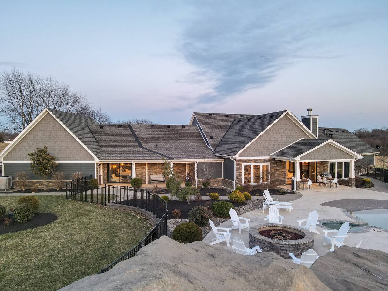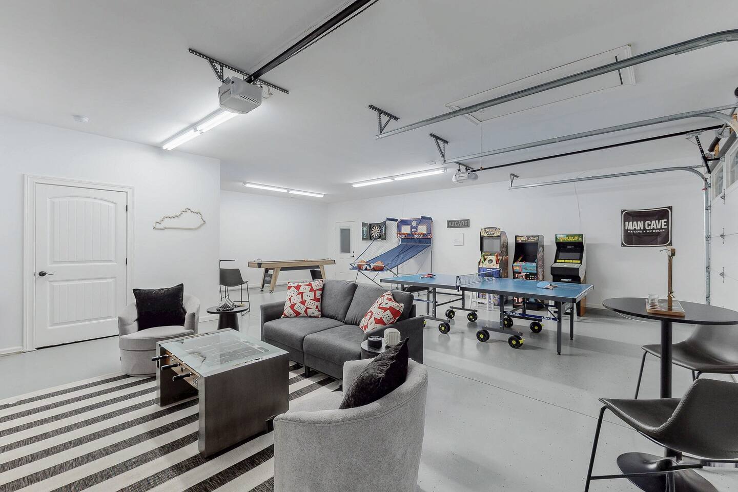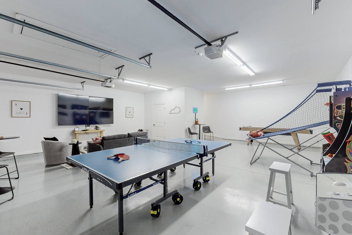 From the moment you arrive, you’ll be surrounded by rolling Bluegrass landscapes, golden sunsets, and the rich aroma of aging bourbon. Whether you’re here to explore historic distilleries, take in the thrill of the racetrack, or simply unwind in an atmosphere of comfort and style, The Bluegrass Grand Estate is your perfect escape into the heart of Kentucky luxury. Step inside through the grand entrance, where you’re immediately welcomed into a bright and inviting foyer. To your right, an elegant dining room awaits—perfect for hosting memorable meals and intimate gatherings. As you continue through the home, you’ll find the open-concept chef’s kitchen, beautifully designed to be both functional and stylish. Sleek countertops, high-end appliances, and ample seating create a space where conversation and cooking flow effortlessly. The fully stocked kitchen includes stainless steel appliances, a refrigerator, coffee maker, blender, toaster, and crockpot, along with all necessary cookware and bakeware. A built-in mini fridge in the second dining room adds extra convenience. Past the kitchen, the home unfolds into the main living area, where plush seating, a large TV, and a cozy sitting room create the perfect ambiance for unwinding after a day of exploring the Bourbon Trail. The estate boasts five beautifully appointed bedrooms, providing ample space for families, friends, and groups to relax in comfort. The Master Suite is a private retreat with a king bed, day bed, additional twin bed, a pack ‘n play, a flat-screen TV, a walk-in closet, and a private laundry room. The en-suite bathroom features a walk-in shower and double sinks. The Kentucky Derby Room is a classic and elegant space with a king bed, luxurious bedding, and a flat-screen TV, conveniently located near the hall bath. The Bluegrass Room offers a warm and inviting setting with a queen bed, a flat-screen TV, and easy access to the hall bath. The Bourbon Room is a sophisticated sanctuary featuring a king bed, private en-suite bathroom with a handicapped-accessible soaking tub, laundry room, and flat-screen TV. Tucked just off the sitting room, the hidden speakeasy offers not only a unique and intimate space to unwind, but also doubles as an additional bedroom thanks to its comfortable futon—ideal for extra guests or a cozy night in. For guests needing to work remotely or stay connected, the estate includes a dedicated office space with a laptop and printer, high-speed Wi-Fi throughout the home, and multiple TVs in all bedrooms and common areas to ensure everyone has their own entertainment space. This estate offers endless entertainment and relaxation options, ensuring every guest experiences a stay like no other. Hidden beyond the fully equipped office space, an entertainment haven awaits, featuring darts, Pop-A-Shot basketball, ping pong, shuffleboard, and classic arcade games, including Big Buck Hunter, Ms. Pac-Man, Galaga, and Golden Tee 3D. Four large TVs make it the ultimate game-day retreat. Tucked away off the sitting room, a hidden speakeasy invites guests to step back in time. With low lighting, rich tones, and plush seating, it’s the perfect spot to enjoy a fine bourbon and great conversation. Step outside into your private backyard paradise, where a shimmering swimming pool with a built-in water slide and cascading waterfall awaits. A luxurious built-in hot tub offers the perfect setting for stargazing. A cozy gas fire pit is surrounded by Adirondack seating for evening gatherings, while an outdoor dining area with a propane grill makes alfresco meals easy and enjoyable. The outdoor area includes a bathroom and dressing room for convenience, as well as a charming outdoor fireplace for cool Kentucky evenings. Ample seating and lounging areas allow guests to fully embrace the outdoor experience. At The Bluegrass Grand Estate, every detail has been thoughtfully curated to create an unforgettable experience. Whether you’re here to explore world-famous distilleries on the Kentucky Bourbon Trail, experience the thrill of horse racing at Churchill Downs, relax in your private poolside retreat, host unforgettable gatherings in a sophisticated setting, enjoy friendly competition in the fully stocked arcade-style game room, or sip bourbon in the speakeasy and indulge in Kentucky’s finest traditions, you’ll find every moment filled with elegance, warmth, and the true spirit of Bluegrass luxury.
