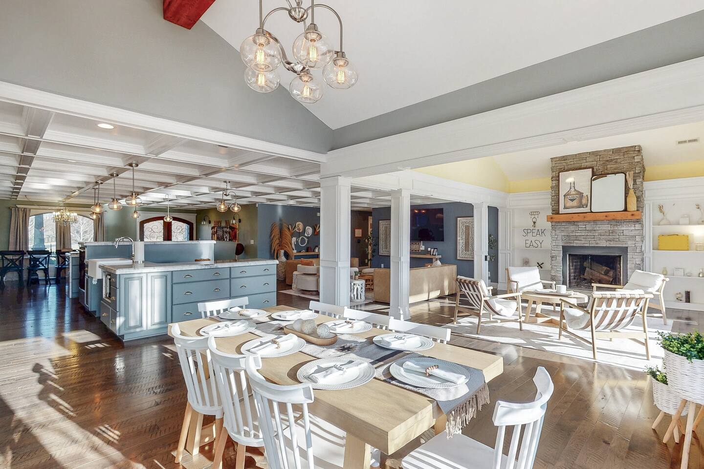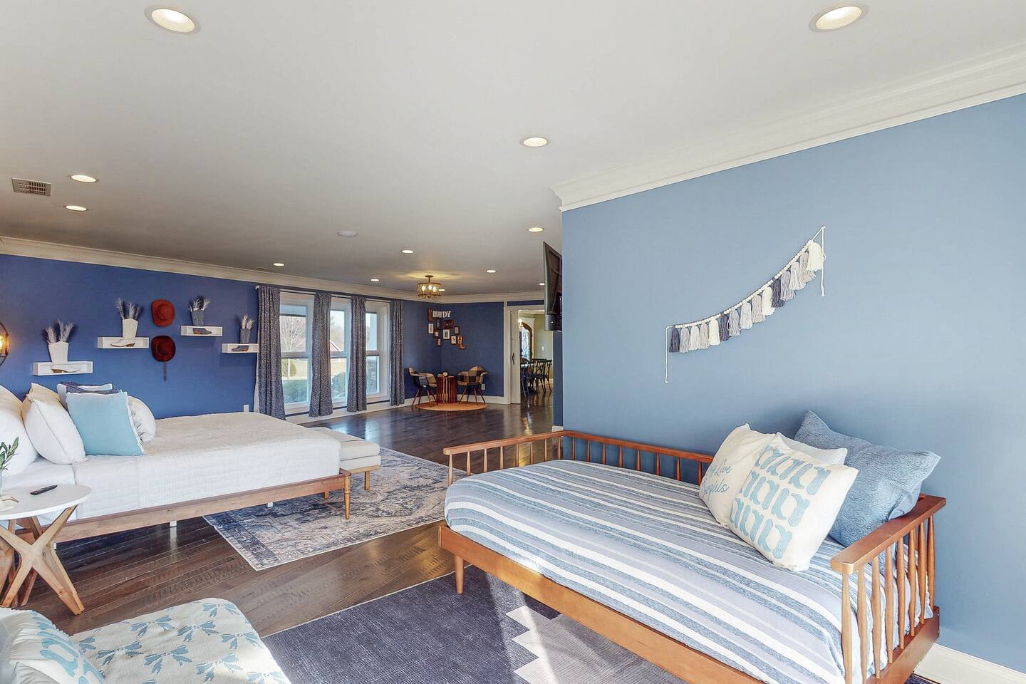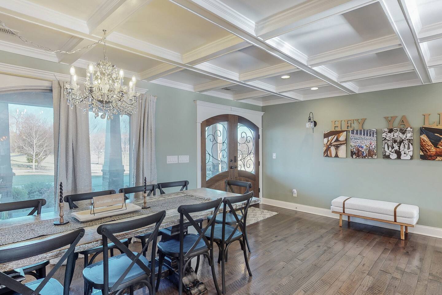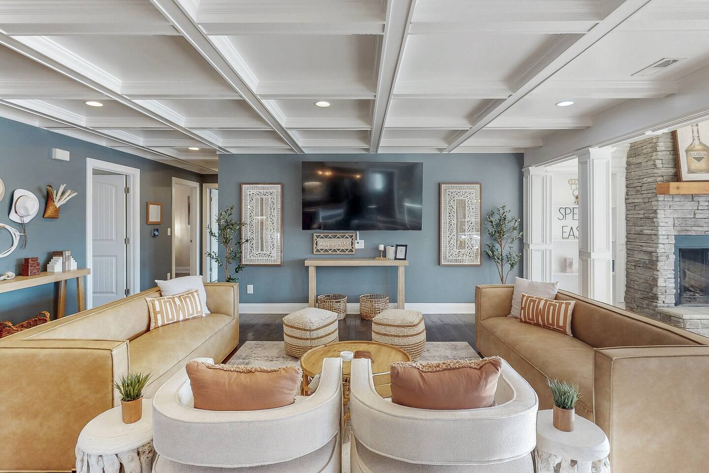 From the moment you arrive, you’ll be surrounded by rolling Bluegrass landscapes, golden sunsets, and the rich aroma of aging bourbon. Whether you’re here to explore historic distilleries, take in the thrill of the racetrack, or simply unwind in an atmosphere of comfort and style, The Bluegrass Grand Estate is your perfect escape into the heart of Kentucky luxury. Step inside through the grand entrance, where you’re immediately welcomed into a bright and inviting foyer. To your right, an elegant dining room awaits—perfect for hosting memorable meals and intimate gatherings. As you continue through the home, you’ll find the open-concept chef’s kitchen, beautifully designed to be both functional and stylish. Sleek countertops, high-end appliances, and ample seating create a space where conversation and cooking flow effortlessly. The fully stocked kitchen includes stainless steel appliances, a refrigerator, coffee maker, blender, toaster, and crockpot, along with all necessary cookware and bakeware. A built-in mini fridge in the second dining room adds extra convenience. Past the kitchen, the home unfolds into the main living area, where plush seating, a large TV, and a cozy sitting room create the perfect ambiance for unwinding after a day of exploring the Bourbon Trail. The estate boasts five beautifully appointed bedrooms, providing ample space for families, friends, and groups to relax in comfort. The Master Suite is a private retreat with a king bed, day bed, additional twin bed, a pack ‘n play, a flat-screen TV, a walk-in closet, and a private laundry room. The en-suite bathroom features a walk-in shower and double sinks. The Kentucky Derby Room is a classic and elegant space with a king bed, luxurious bedding, and a flat-screen TV, conveniently located near the hall bath. The Bluegrass Room offers a warm and inviting setting with a queen bed, a flat-screen TV, and easy access to the hall bath. The Bourbon Room is a sophisticated sanctuary featuring a king bed, private en-suite bathroom with a handicapped-accessible soaking tub, laundry room, and flat-screen TV. Tucked just off the sitting room, the hidden speakeasy offers not only a unique and intimate space to unwind, but also doubles as an additional bedroom thanks to its comfortable futon—ideal for extra guests or a cozy night in. For guests needing to work remotely or stay connected, the estate includes a dedicated office space with a laptop and printer, high-speed Wi-Fi throughout the home, and multiple TVs in all bedrooms and common areas to ensure everyone has their own entertainment space. This estate offers endless entertainment and relaxation options, ensuring every guest experiences a stay like no other. Hidden beyond the fully equipped office space, an entertainment haven awaits, featuring darts, Pop-A-Shot basketball, ping pong, shuffleboard, and classic arcade games, including Big Buck Hunter, Ms. Pac-Man, Galaga, and Golden Tee 3D. Four large TVs make it the ultimate game-day retreat. Tucked away off the sitting room, a hidden speakeasy invites guests to step back in time. With low lighting, rich tones, and plush seating, it’s the perfect spot to enjoy a fine bourbon and great conversation. Step outside into your private backyard paradise, where a shimmering swimming pool with a built-in water slide and cascading waterfall awaits. A luxurious built-in hot tub offers the perfect setting for stargazing. A cozy gas fire pit is surrounded by Adirondack seating for evening gatherings, while an outdoor dining area with a propane grill makes alfresco meals easy and enjoyable. The outdoor area includes a bathroom and dressing room for convenience, as well as a charming outdoor fireplace for cool Kentucky evenings. Ample seating and lounging areas allow guests to fully embrace the outdoor experience. At The Bluegrass Grand Estate, every detail has been thoughtfully curated to create an unforgettable experience. Whether you’re here to explore world-famous distilleries on the Kentucky Bourbon Trail, experience the thrill of horse racing at Churchill Downs, relax in your private poolside retreat, host unforgettable gatherings in a sophisticated setting, enjoy friendly competition in the fully stocked arcade-style game room, or sip bourbon in the speakeasy and indulge in Kentucky’s finest traditions, you’ll find every moment filled with elegance, warmth, and the true spirit of Bluegrass luxury.